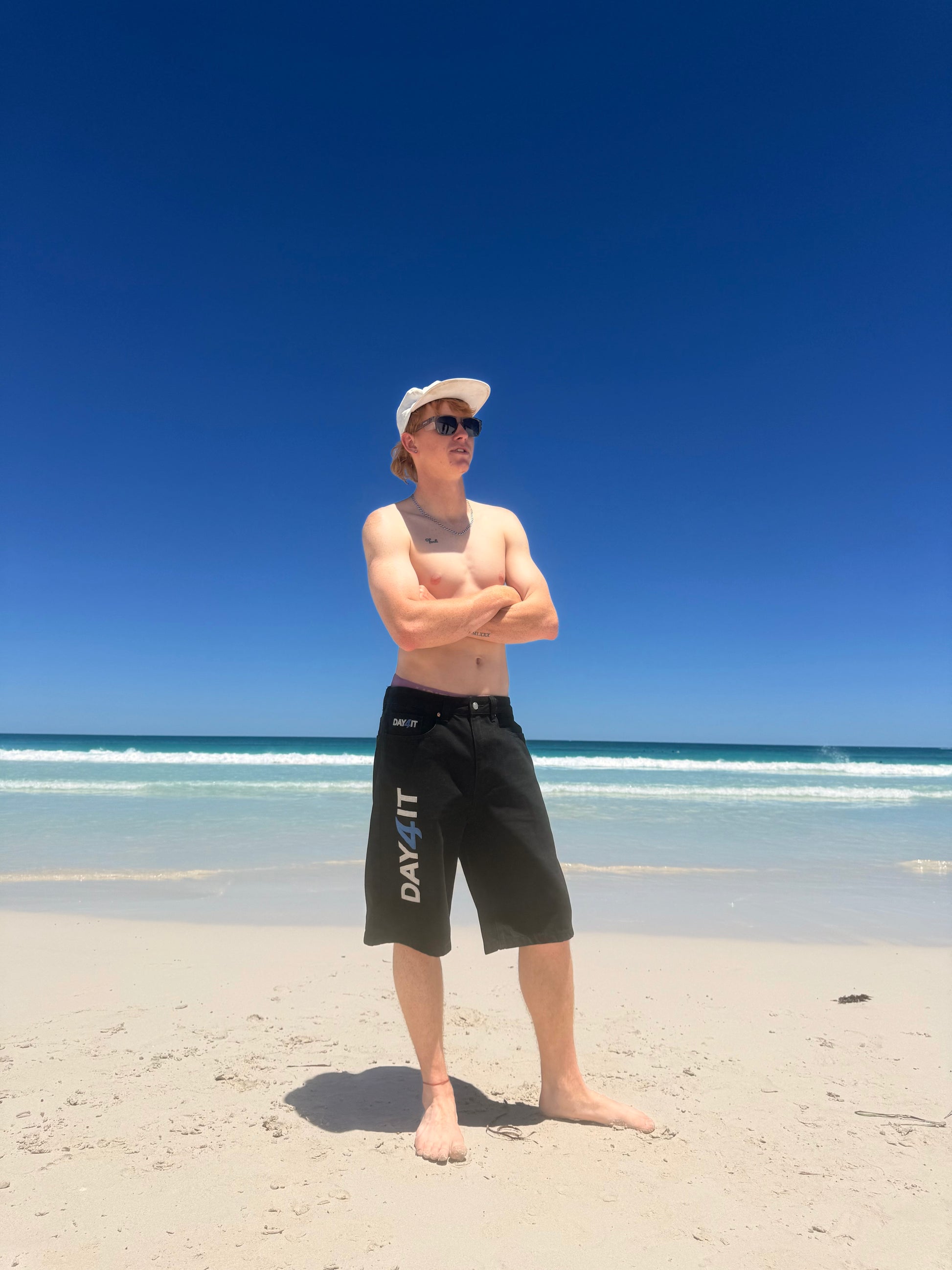 Bold, sleek, and built for action. The Backwash Black Jorts are premium black denim with DAY4IT embroidery - made to take you from surf checks to late nights.